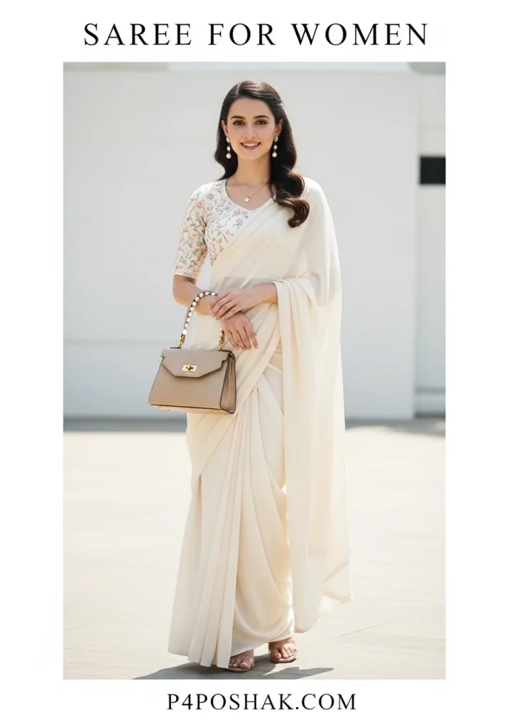 7. Ivory Crepe Saree with Pastel Embroidered Blouse + Nude Heels + Beige Bag