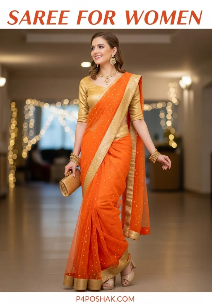 Vibrant orange net saree is ideal for festive gatherings. The lightweight net ensures comfort and easy draping. Tip: Pair with golden jewelry and neutral heels to create a striking yet balanced outfit.