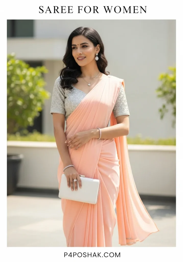 Shop Now from Amazon: Peach Pastel Georgette Saree + Silver Thread Blouse + Silver Heels + White Clutch