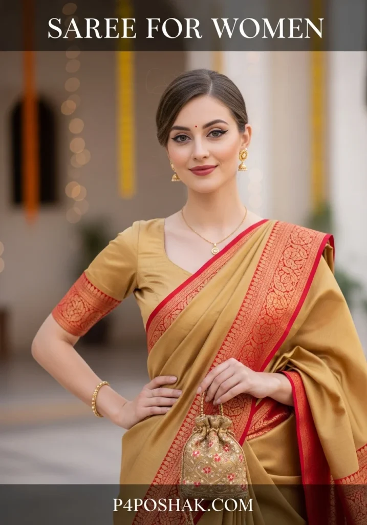 Golden beige silk saree with red border creates a traditional yet festive look. Elegant and comfortable for weddings or religious functions. From my experience, minimal jewelry enhances its luxurious appeal.