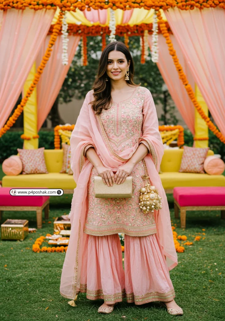 1. Pastel Pink Embroidered Sharara Suit for Mehendi