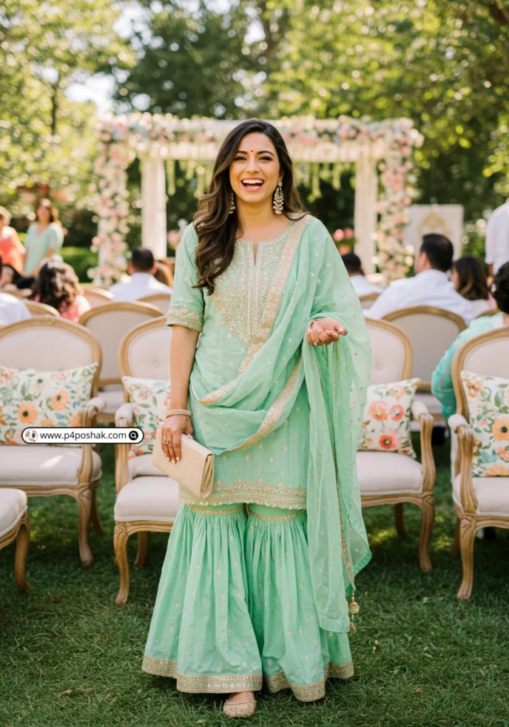 Mint green embroidered shararas are refreshing for daytime events. Pinterest Trends highlight mint tones as trending for spring-summer weddings. Perfect for staying comfortable while looking stylish and vibrant.
