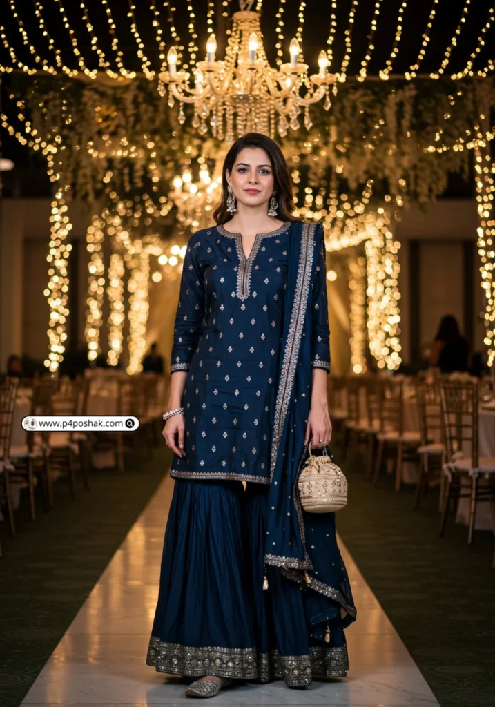 Navy blue silk shararas offer a bold yet sophisticated look for evening parties. Vogue India recommends deep jewel tones for evening weddings. Pair with statement earrings for a polished finish.