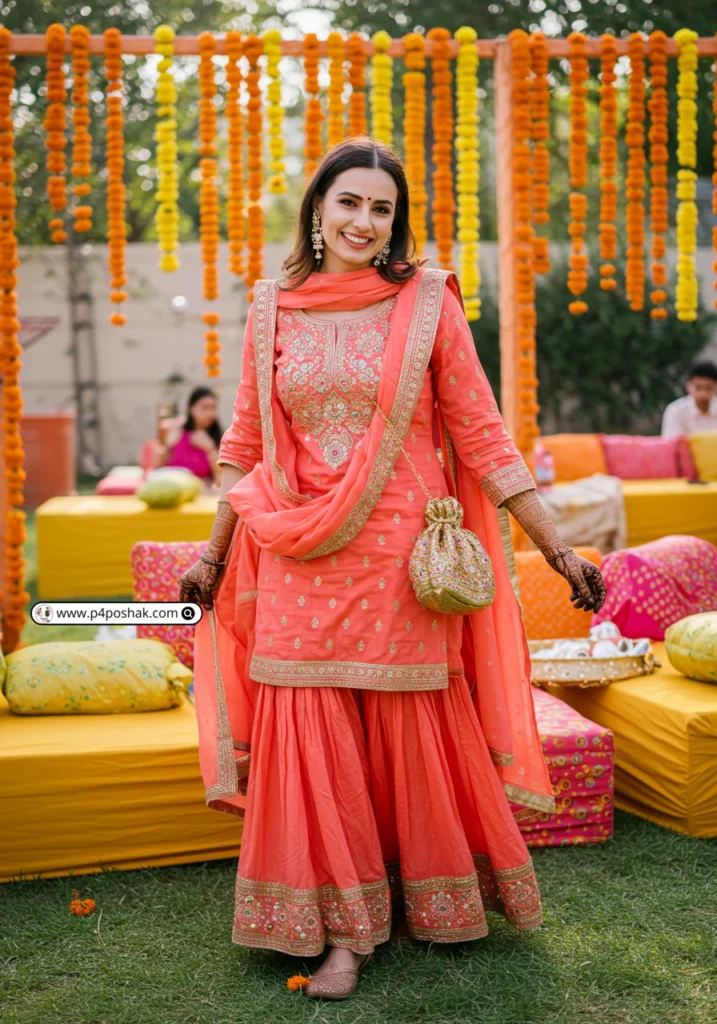 12. Coral Pink Sharara Suit for Mehendi or Haldi