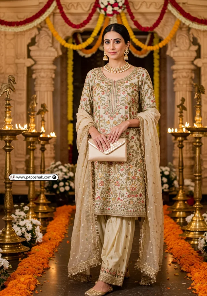 Off-white sharara suits with subtle zari work are perfect for sangeet nights. Femina India emphasizes that metallic embroidery adds a royal touch without overwhelming the look. Lightweight and airy, it allows for dancing and long celebrations.