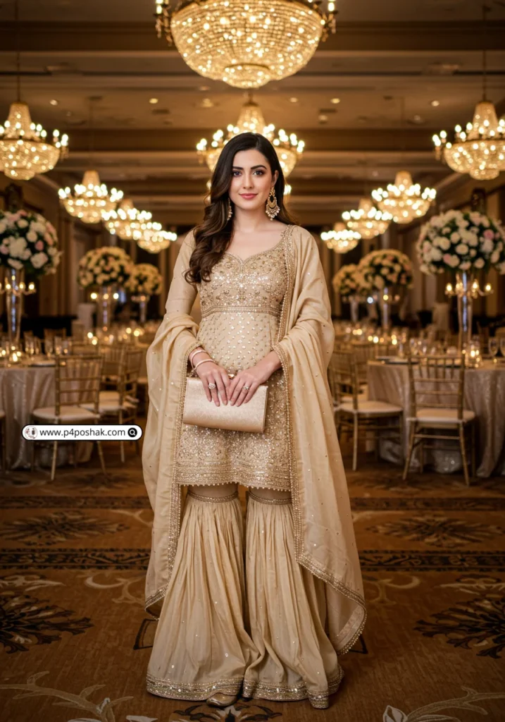 Soft champagne georgette shararas are ideal for receptions. Lightweight and elegant, they offer ease of movement while making a stylish statement. Perfect for daytime or evening functions.