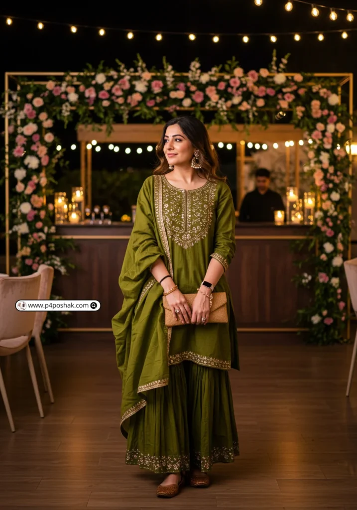 Olive green shararas offer a unique, contemporary look for cocktail parties. Lightweight fabric and subtle embroidery make it comfortable yet stylish. Perfect for standing out in a crowd.