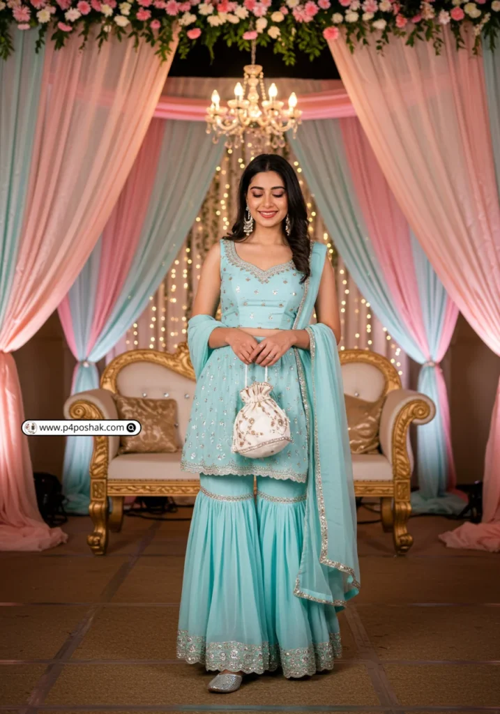 Baby blue shararas are soft and charming, ideal for sangeet nights. Pinterest shows pastel blues trending for youthful festive occasions. Pair with minimal jewelry for a graceful look.
