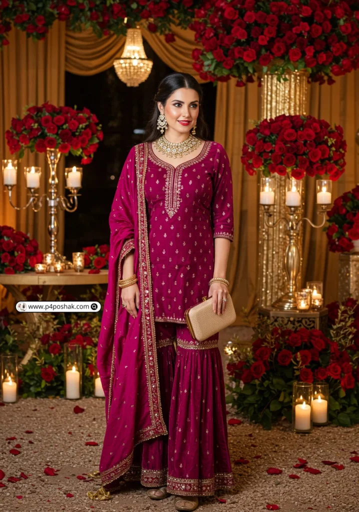 Magenta velvet shararas are luxurious for winter receptions. Velvet ensures warmth while giving a rich festive feel. Perfect for bridesmaids or wedding guests seeking elegance.
