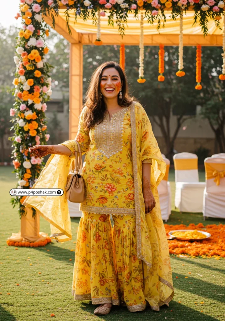20. Yellow Floral Sharara Suit for Daytime Functions