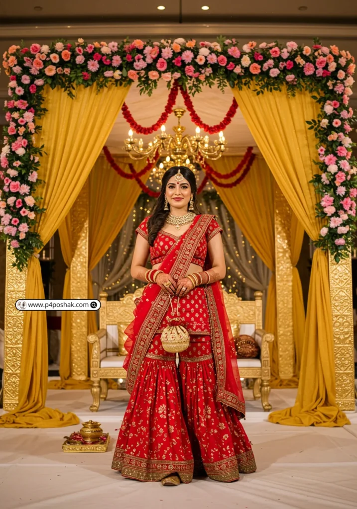 Red and gold shararas create a royal wedding-day look. Harper’s Bazaar India emphasizes bold, metallic accents for traditional celebrations. Comfortable yet striking, this outfit ensures all eyes are on you.
