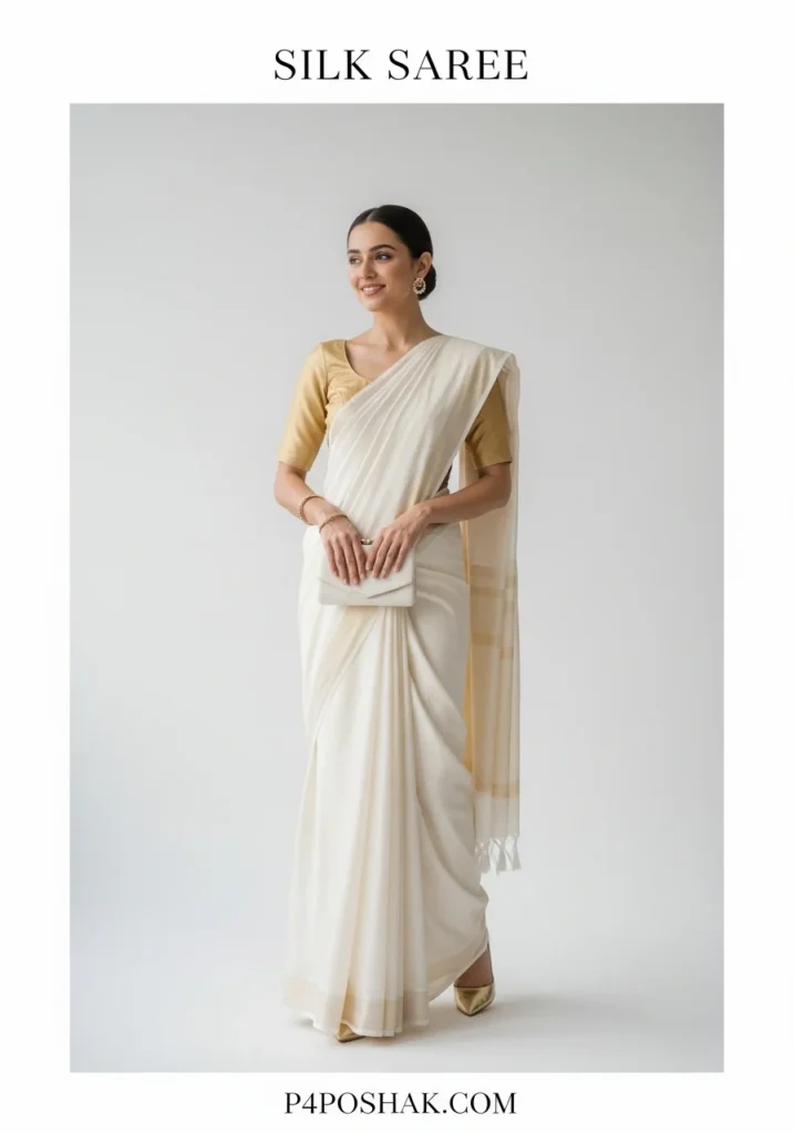 A white silk saree reflects serenity and grace. Perfect for elegant events or minimalist brides, it radiates sophistication with subtle gold detailing. (As featured in Harper’s Bazaar India 2025 wedding trends.)
