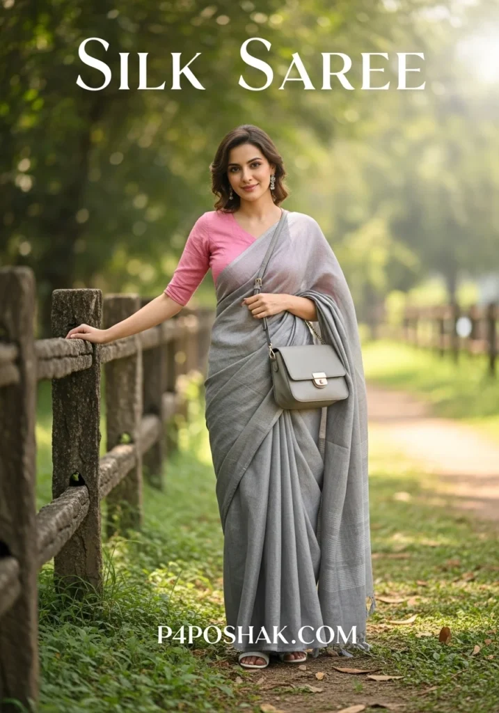 Shop Now from Amazon: Linen Silk Saree – Grey Silk Saree + Pink Blouse + White Sandals + Grey Bag