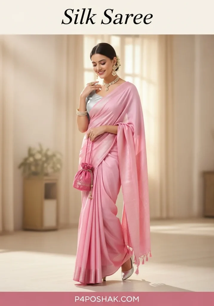 A soft silk saree in pastel pink adds feminine charm to any event. Lightweight, graceful, and stylish, it’s perfect for daytime functions or small family celebrations. (Tip: Add pearl jewelry for a delicate touch.)