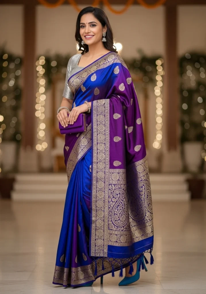 The rich texture of raw silk adds natural beauty to your look. This royal blue silk saree makes a statement at receptions or festive evenings. (As seen in Elle India’s 2025 festive trends.)