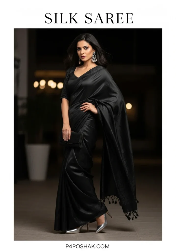Shop Now from Amazon: Black Designer Silk Saree – Black Silk Saree + Black Blouse + Silver Heels + Black Clutch