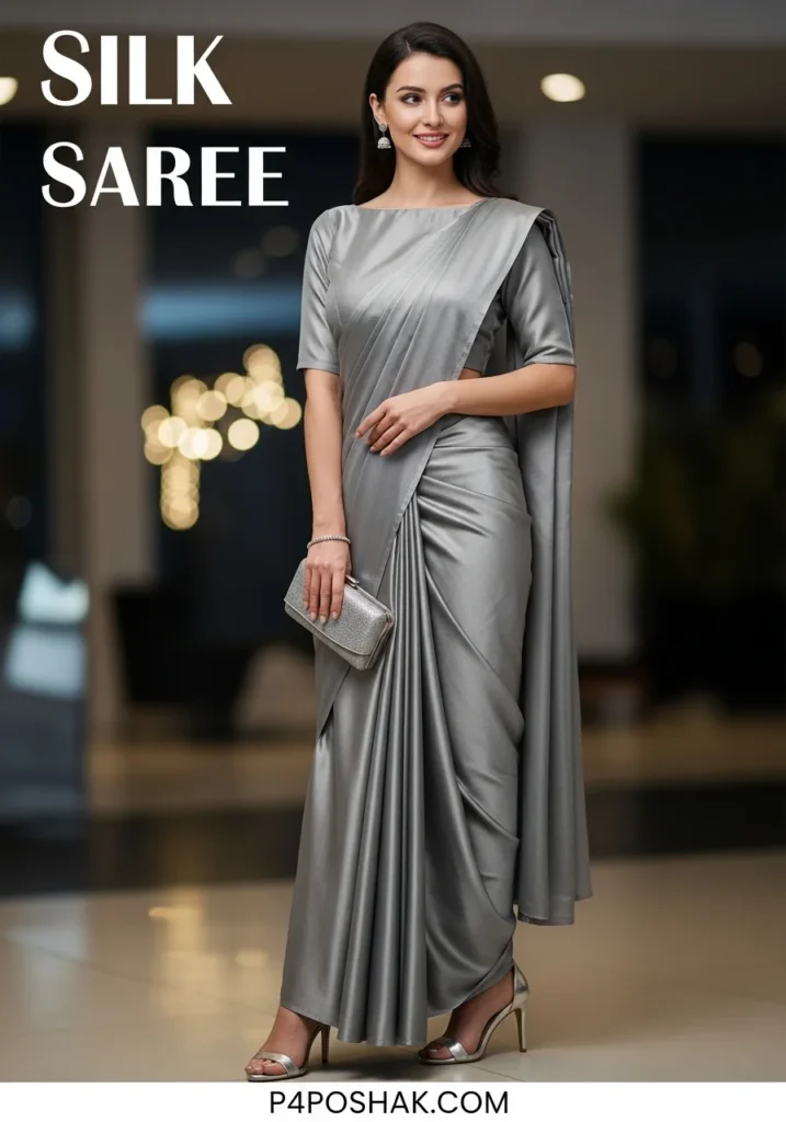Shop Now from Amazon: Satin Silk Saree – Grey Silk Saree + Grey Blouse + Silver Sandals + Silver Clutch