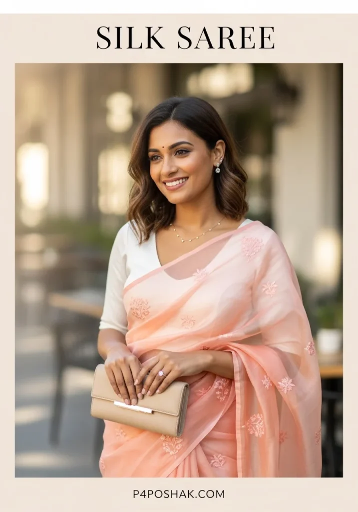 Modern and romantic, the organza silk saree is every fashionista’s favorite. The sheer fabric and floral patterns add youthful freshness. I wore one for a friend’s brunch party — light, chic, and picture-perfect!