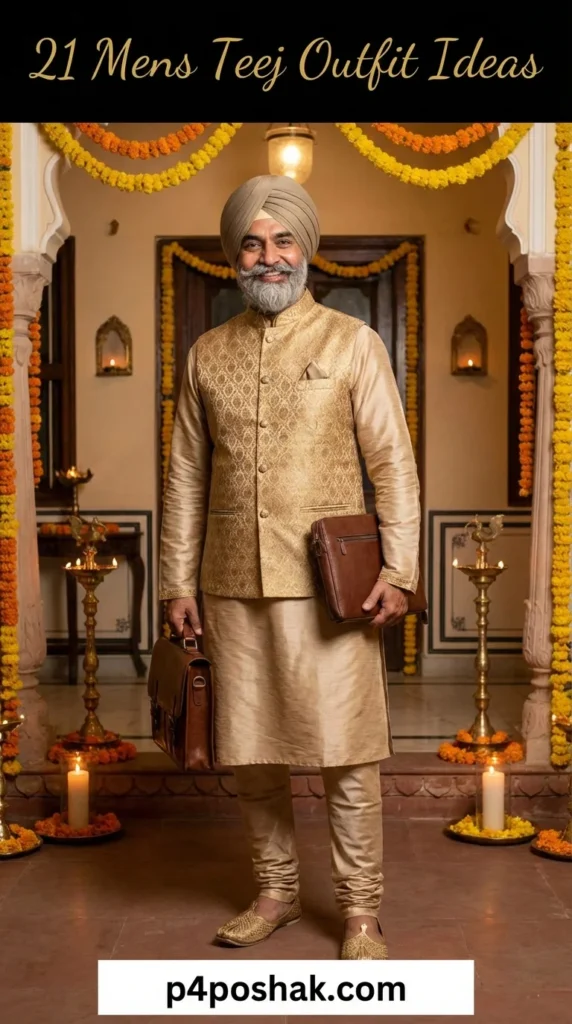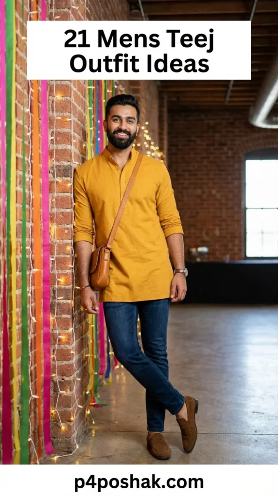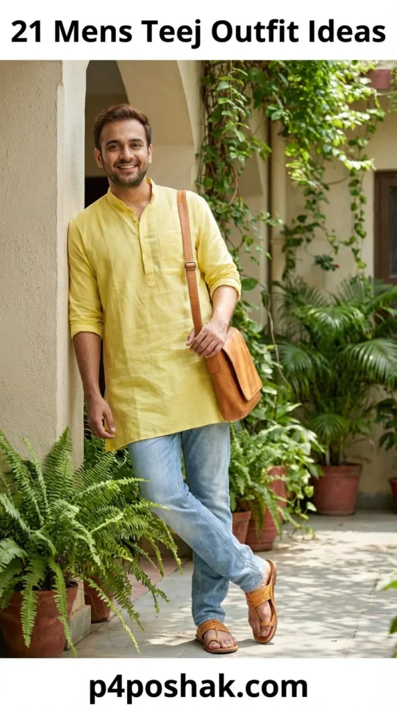For a modern twist, pair a vibrant mustard short kurta with well-fitted jeans. This fusion style is comfortable for younger men attending casual Teej parties. It’s practical, stylish, and allows you to move freely all day long.
