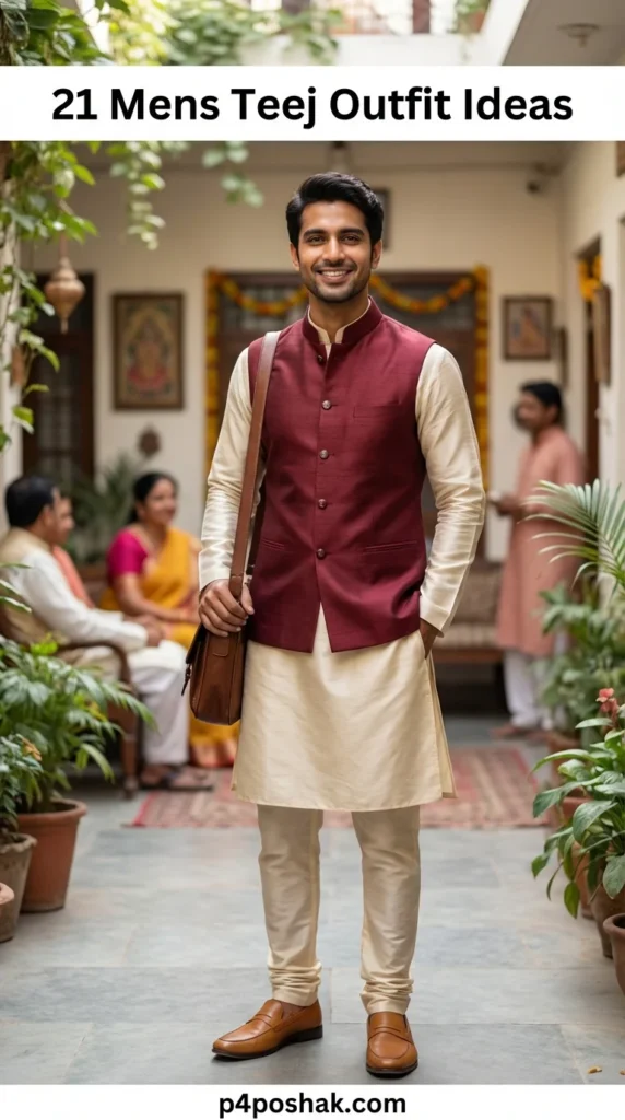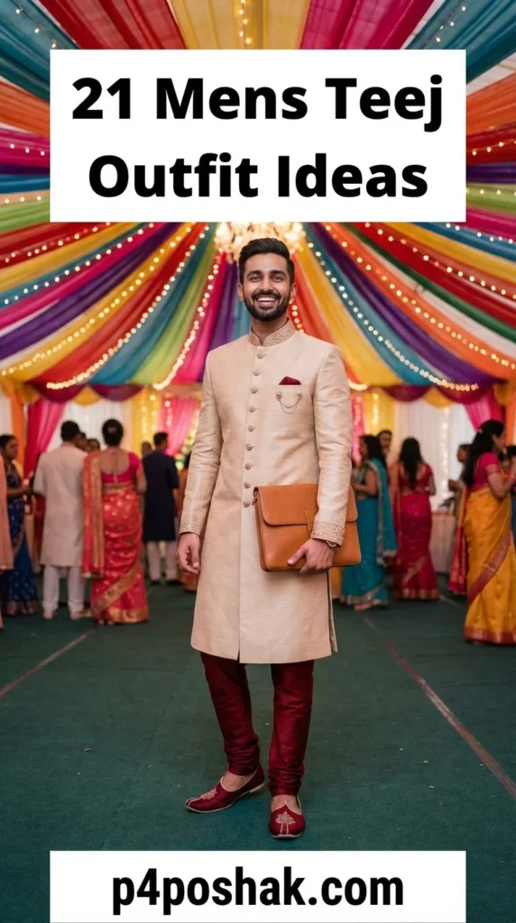 For a very formal Teej look, choose a lightweight sherwani. The beige and maroon combination is a classic Indian favorite. It provides a structured, royal feel that is perfect for hosting guests or attending large-scale community celebrations.