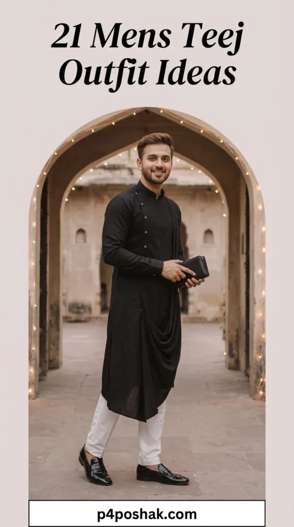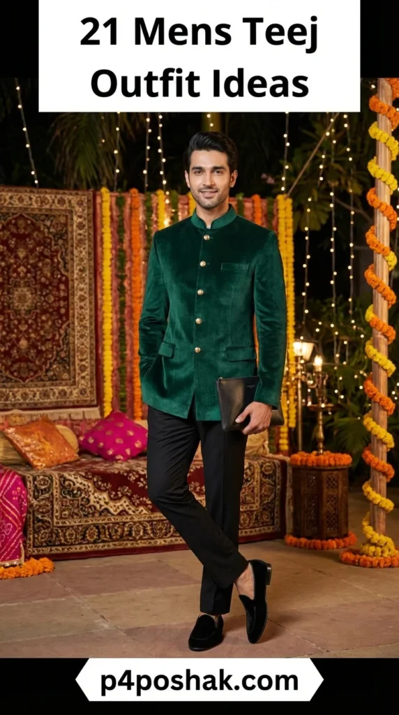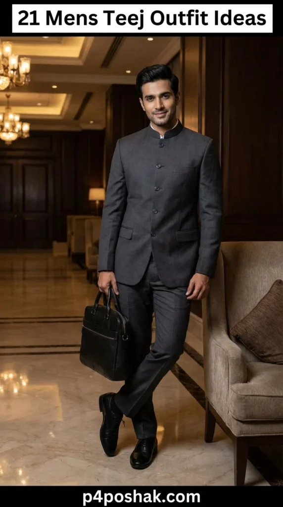 A Bandhgala is the epitome of Indian formal wear. This charcoal grey set offers a sharp, tailored silhouette. It’s ideal for formal Teej dinners where you want to project power and elegance. This look never goes out of style.