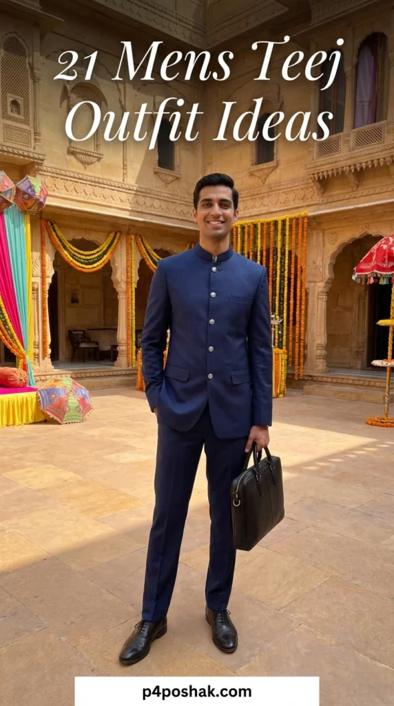 The Jodhpuri suit offers a structured, military-inspired elegance. Navy blue is a safe yet powerful color choice. This outfit makes you look taller and broader, giving you an instant boost of confidence for any grand Teej event.