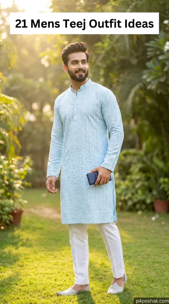 To add a modern touch, try layering a floral Nehru jacket over a soft silk kurta, or opt for a sophisticated Chikankari kurta for family gatherings. Since Teej falls during the humid season, breathable fabrics like cotton-silk blends will keep you comfortable while looking royal.