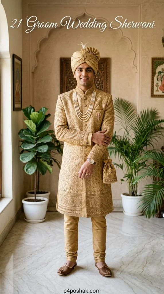 Gold thread embroidery symbolizes luxury and heritage. This sherwani style is perfect for grand palace weddings or traditional ceremonies. Fashion experts frequently highlight gold detailing as one of the most timeless groom design elements.