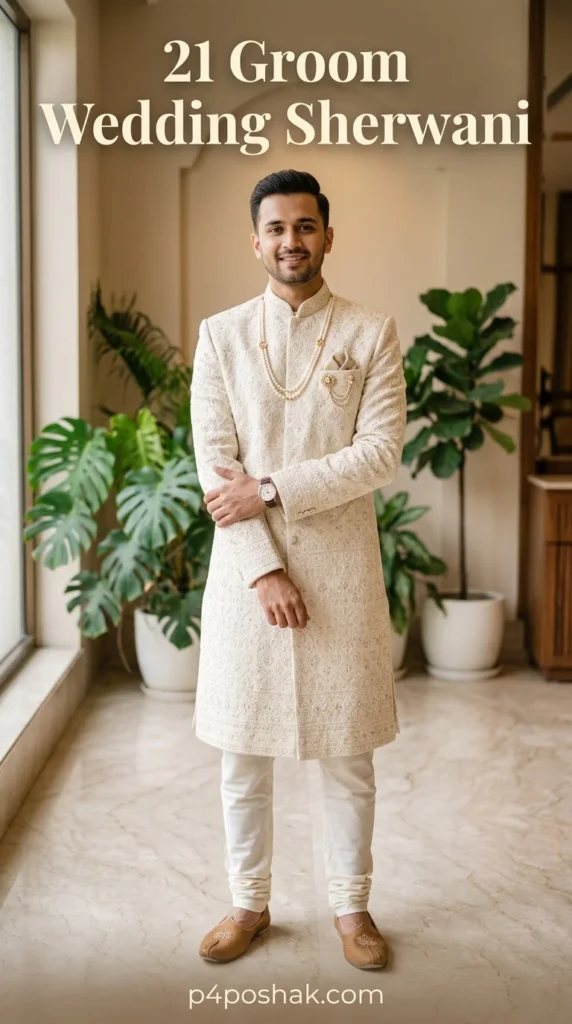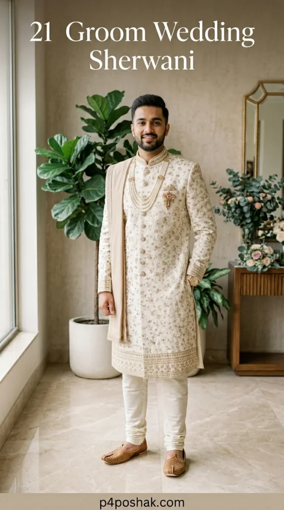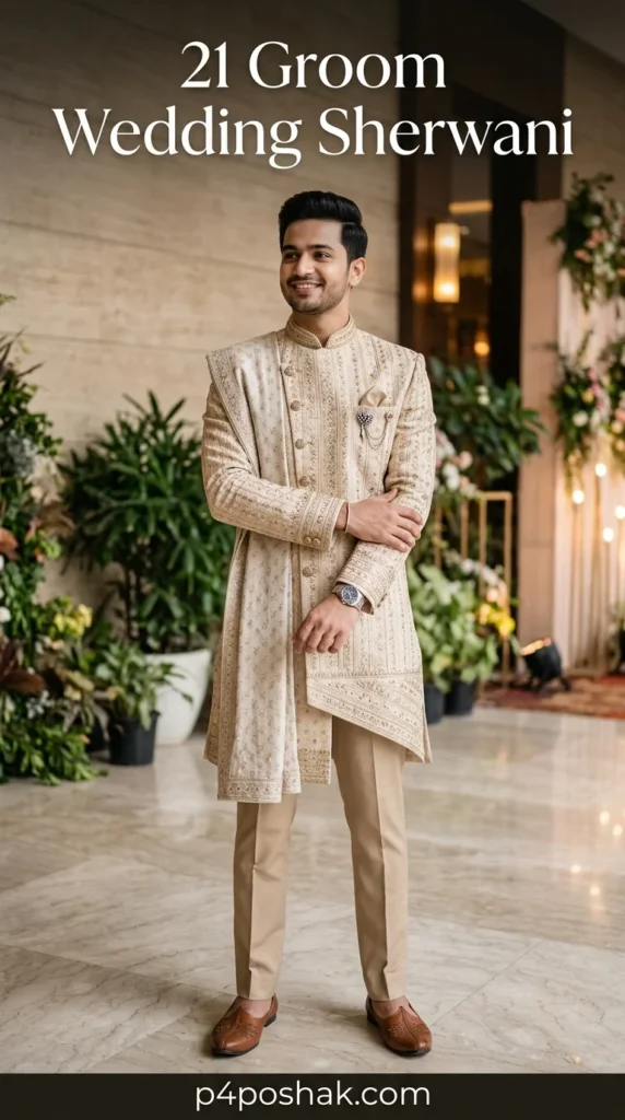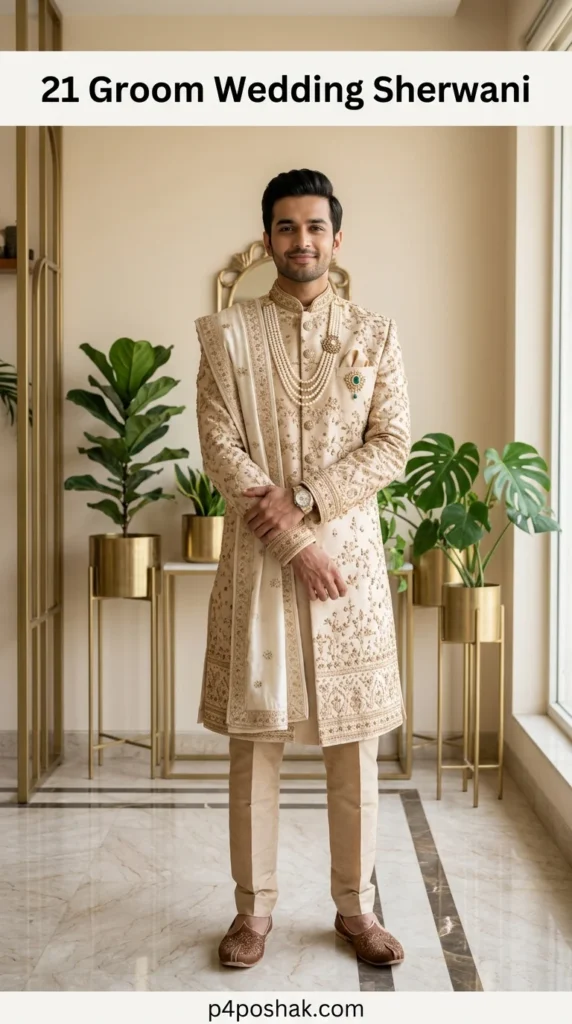 A cream sherwani offers understated elegance for grooms who prefer refined style. Light embroidery keeps the outfit sophisticated without appearing overly heavy, making it comfortable for long wedding rituals and ceremonies.
