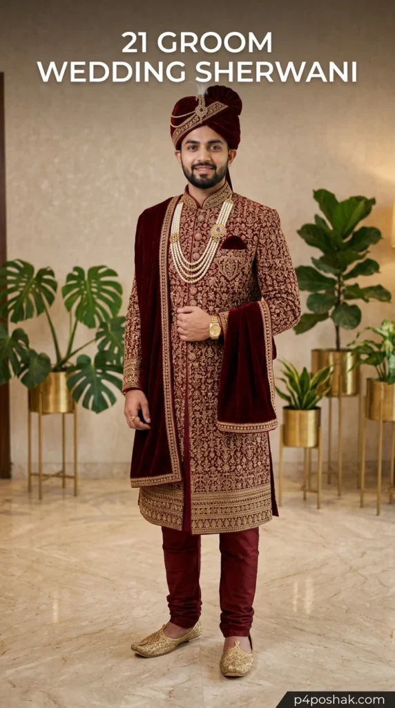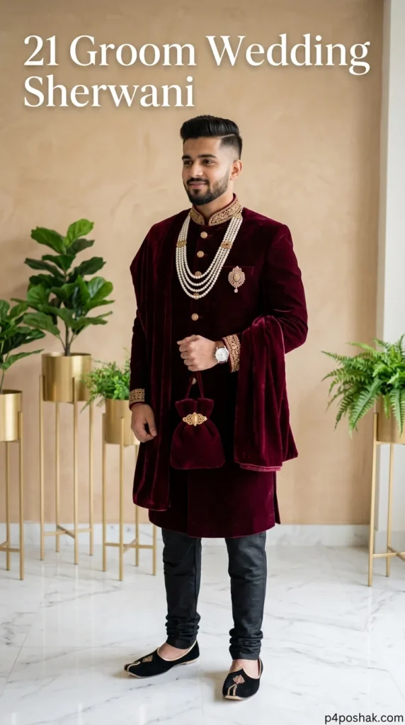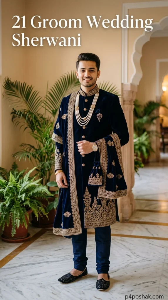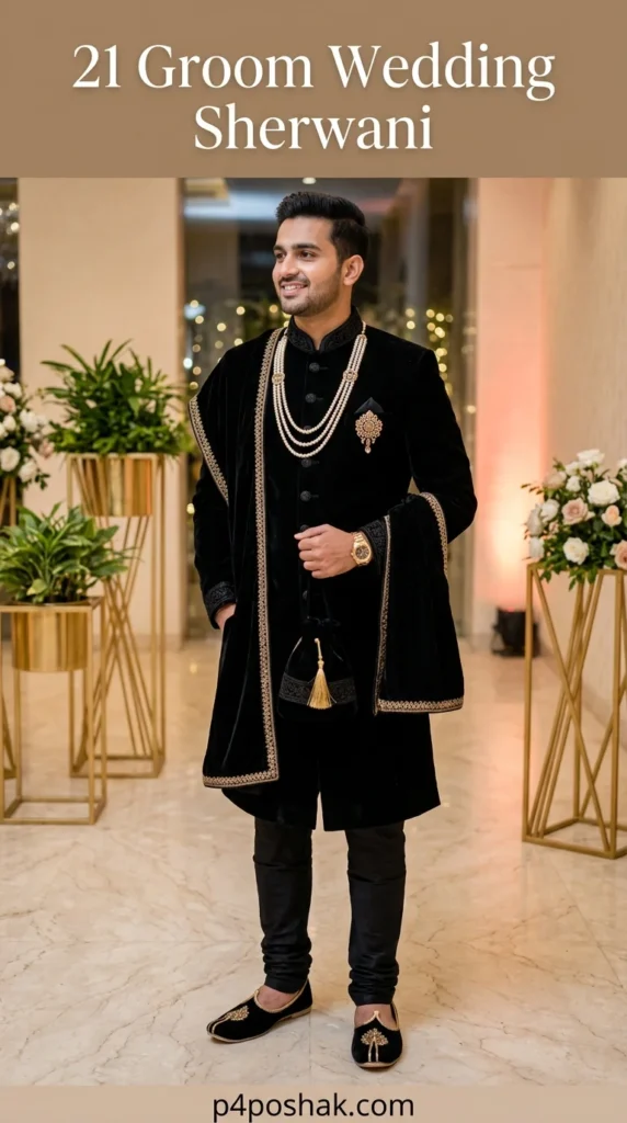 Black velvet sherwanis create an ultra-luxurious groom appearance. The rich fabric reflects light subtly, making it perfect for winter weddings or evening receptions. Designers often suggest velvet sherwanis for grooms who want a bold royal look.