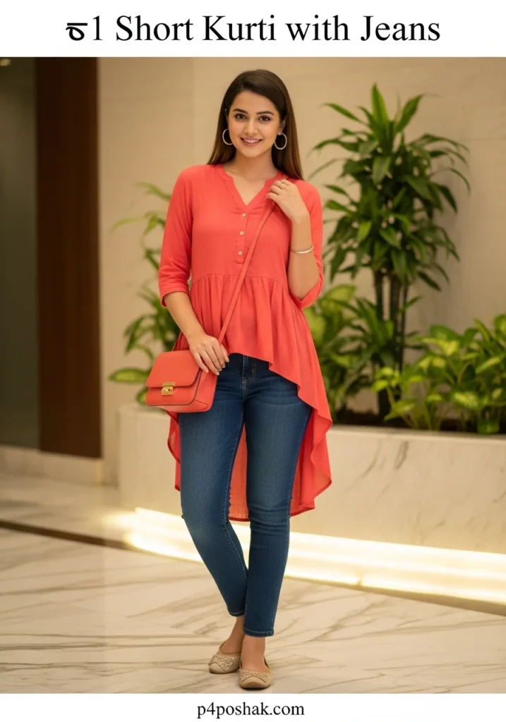 The coral high-low kurti adds a playful dimension to dark blue slim-fit jeans. Beige flats and a matching coral crossbody bag make the outfit ideal for daytime events, casual shopping trips, or friendly meetups, combining style with comfort.