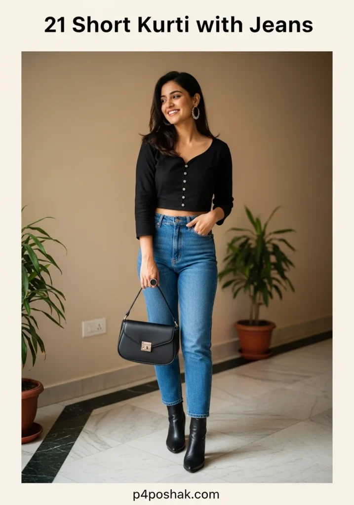 A black cropped kurti paired with high-waisted blue jeans accentuates the waistline. Black ankle boots and a matching satchel bag add a touch of edginess, perfect for a night out or casual day events.
