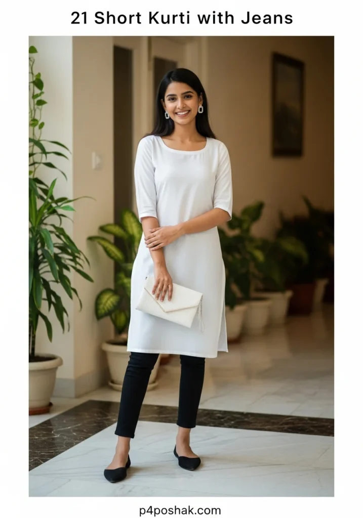 A white straight-cut kurti combined with black skinny jeans offers a timeless and sophisticated look. The black pointed-toe flats and white clutch add elegance, making this outfit suitable for office wear or evening outings.