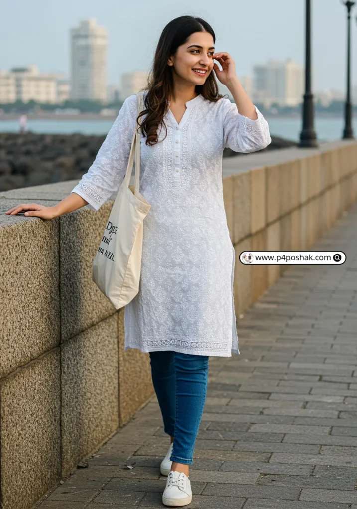 For a casual day out, pairing the white chikankari kurti with blue skinny jeans offers a blend of traditional and modern styles. White sneakers and a tote bag complete the relaxed yet chic look.